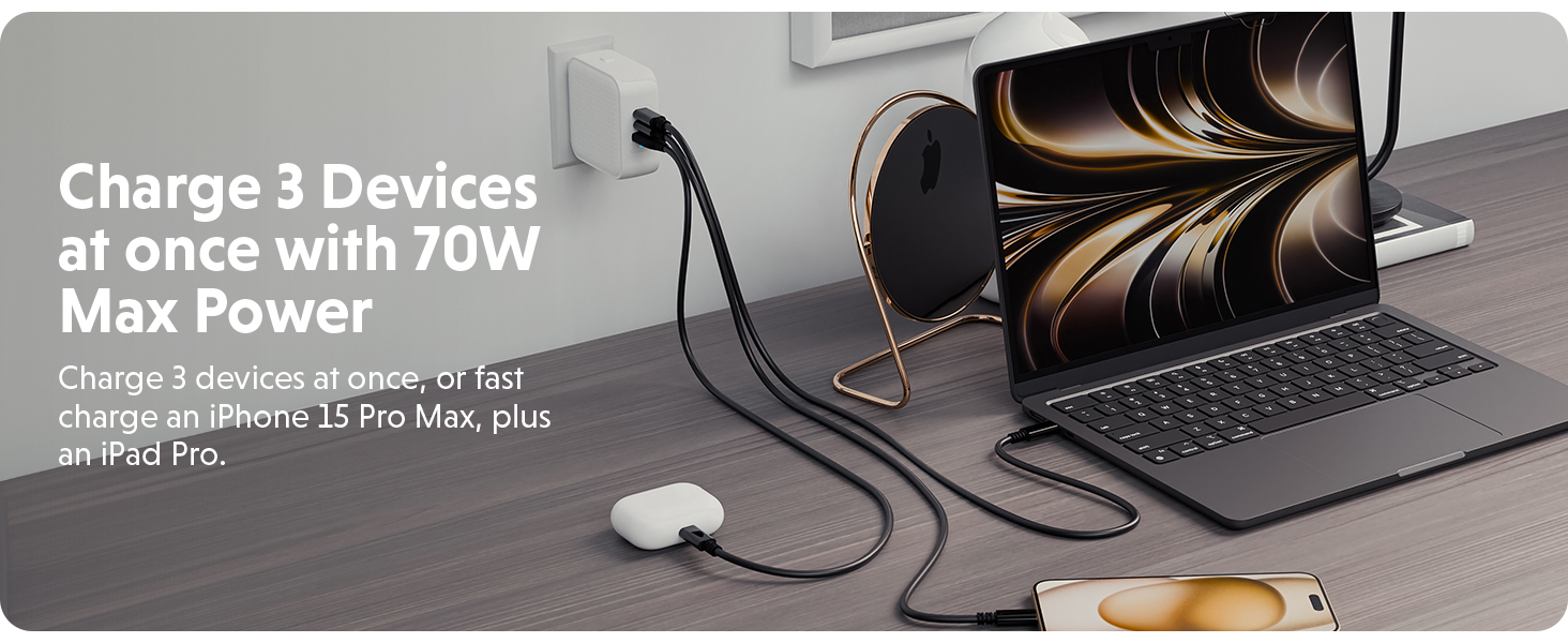 - Với 2 cổng USB-C và 1 cổng USB-A, bạn có thể sạc liền mạch máy tính xách tay, điện thoại, máy tính bảng hoặc tai nghe cùng lúc với tổng công suất 70W.