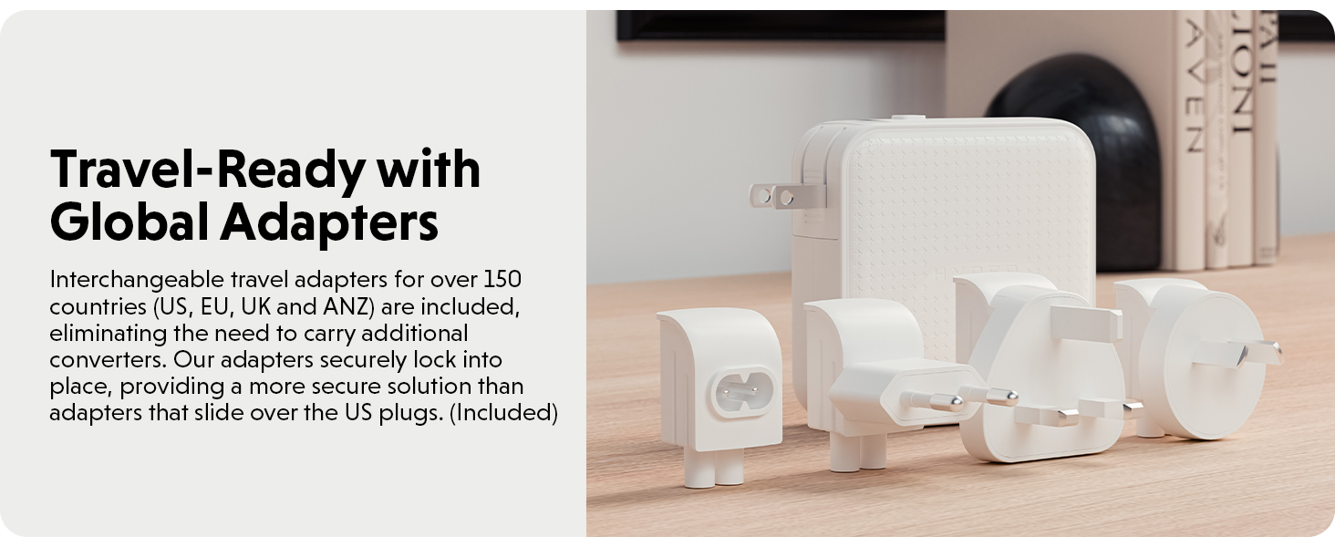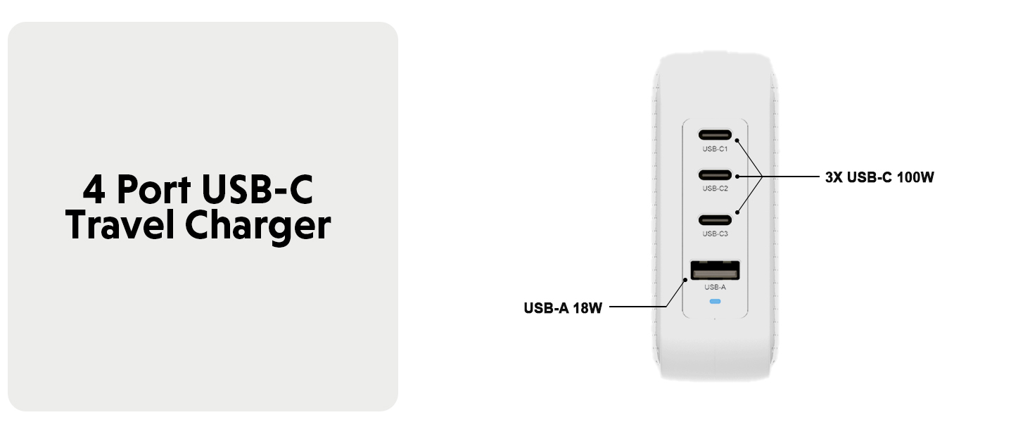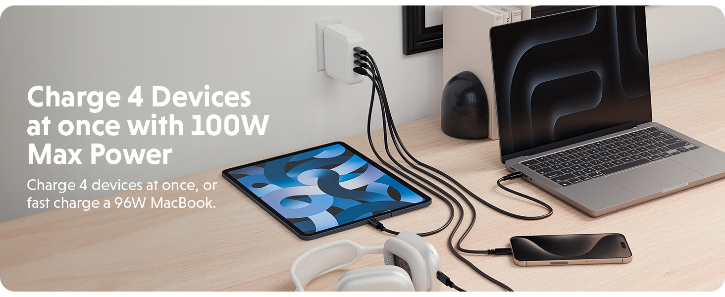 - Với 3 cổng USB-C và 1 cổng USB-A, bạn có thể sạc liền mạch máy tính xách tay, điện thoại, máy tính bảng hoặc tai nghe cùng lúc với tổng công suất đầu ra là 100W.