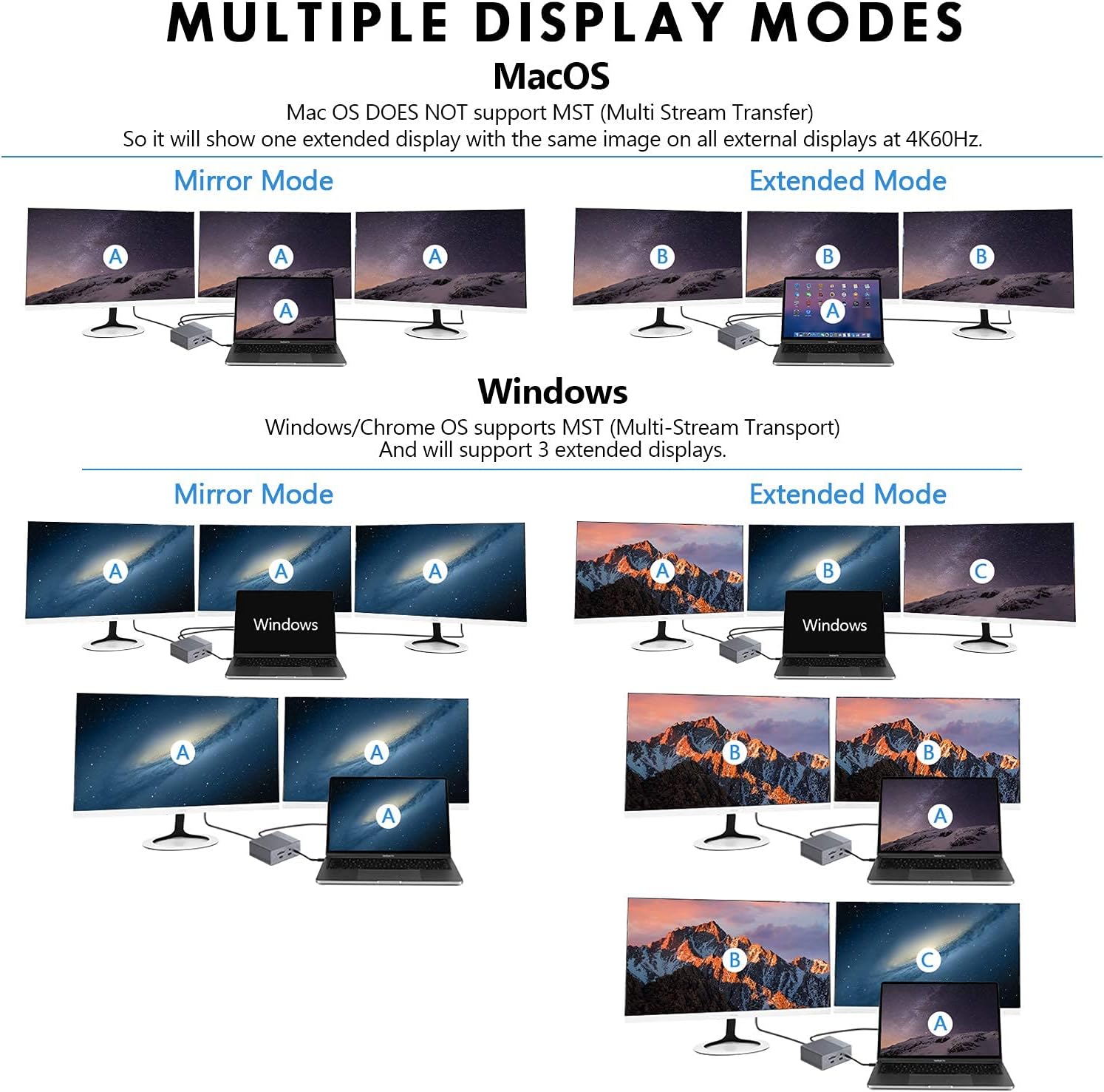 Bộ Chuyển Hỗ Trợ Đa Màn Hình – MacOS: Hỗ trợ SST (Single Stream Transport), tất cả màn hình mở rộng sẽ hiển thị cùng một hình ảnh ở tối đa 4K60Hz.