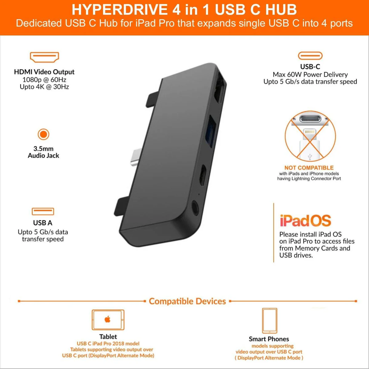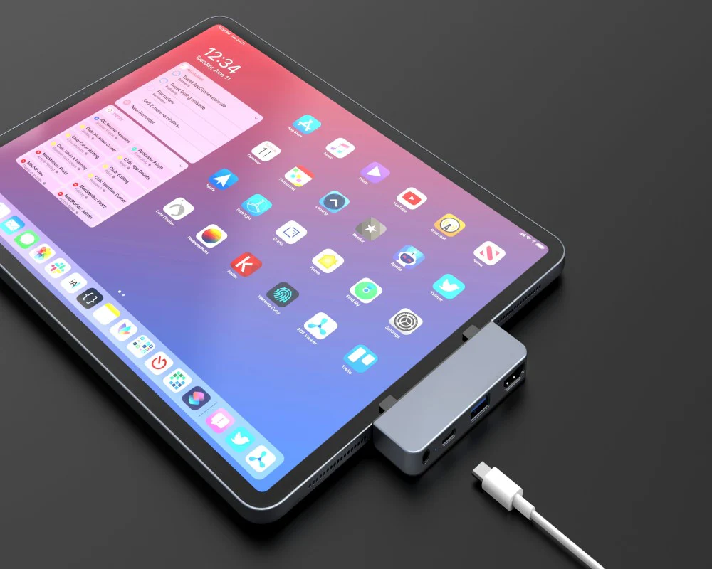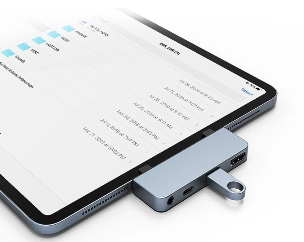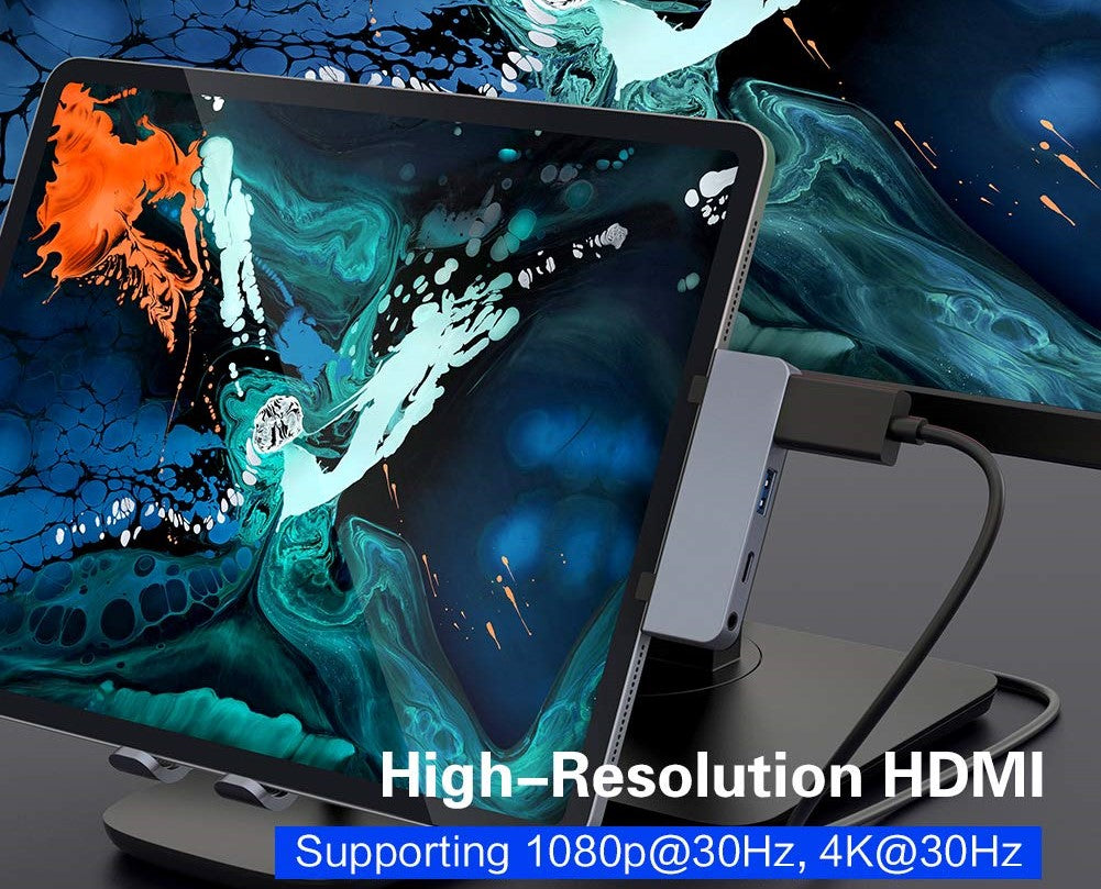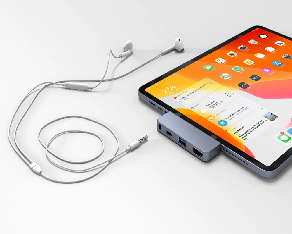 - Kết nối trực tiếp từ USBC của iPad Pro 2018/2019 để xuất ra 4 cổng (4K HDMI, 3.5mm audio jack, USB-A and USB-C Power Delivery)
