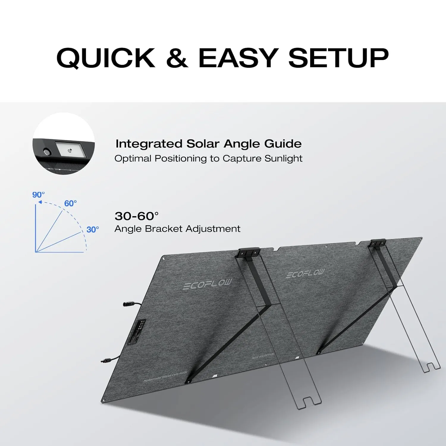 Tấm pin được trang bị giá đỡ và thanh dẫn hướng góc thông minh, có thể điều chỉnh từ 30° – 60°. Chỉ mất vài giây để căn chỉnh tấm pin luôn vuông góc 90° với ánh sáng mặt trời, đảm bảo lượng điện thu vào luôn ở mức tối ưu.