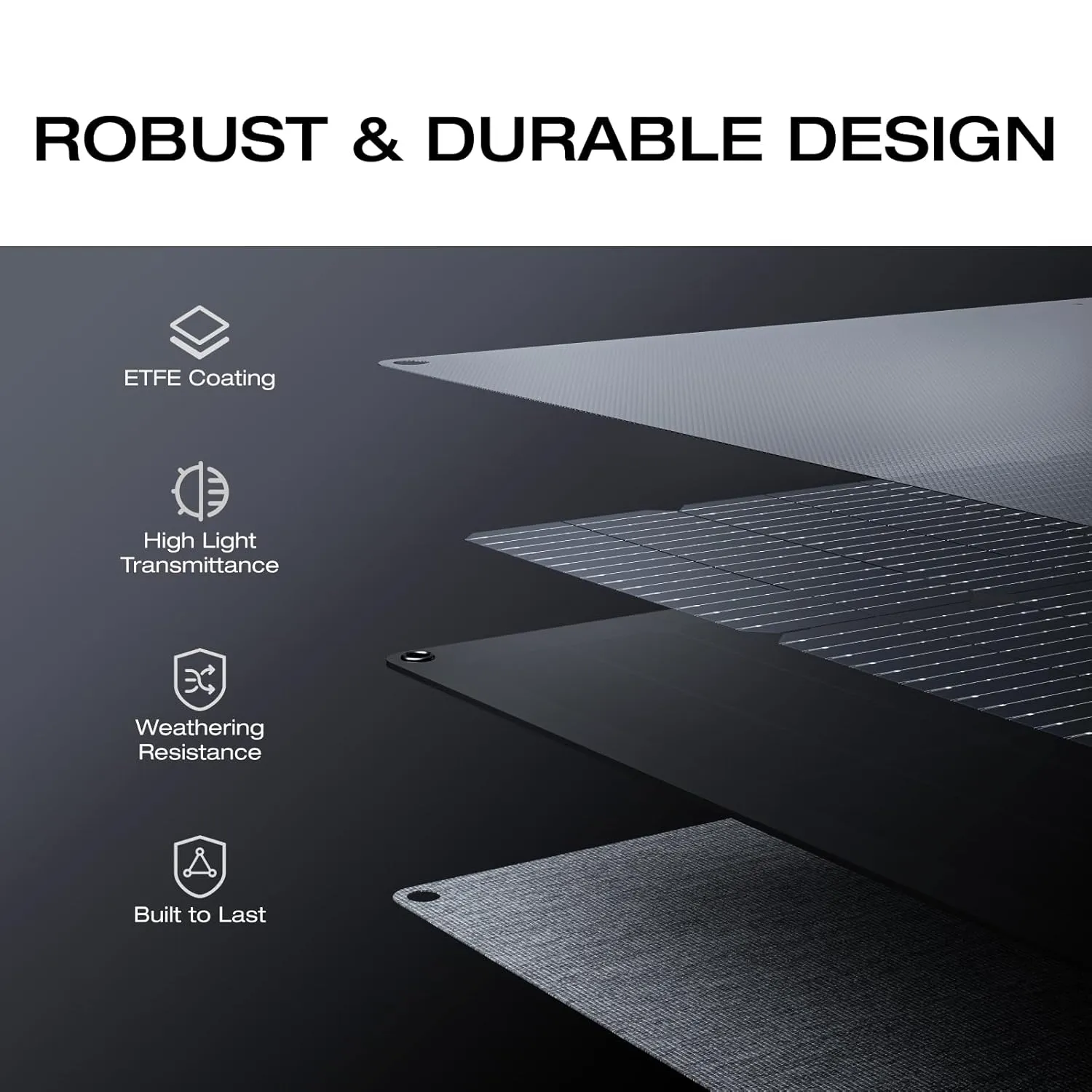 - Lớp màng phủ ETFE giúp tấm pin chống tia UV, hạn chế lão hóa và tăng tuổi thọ sử dụng.